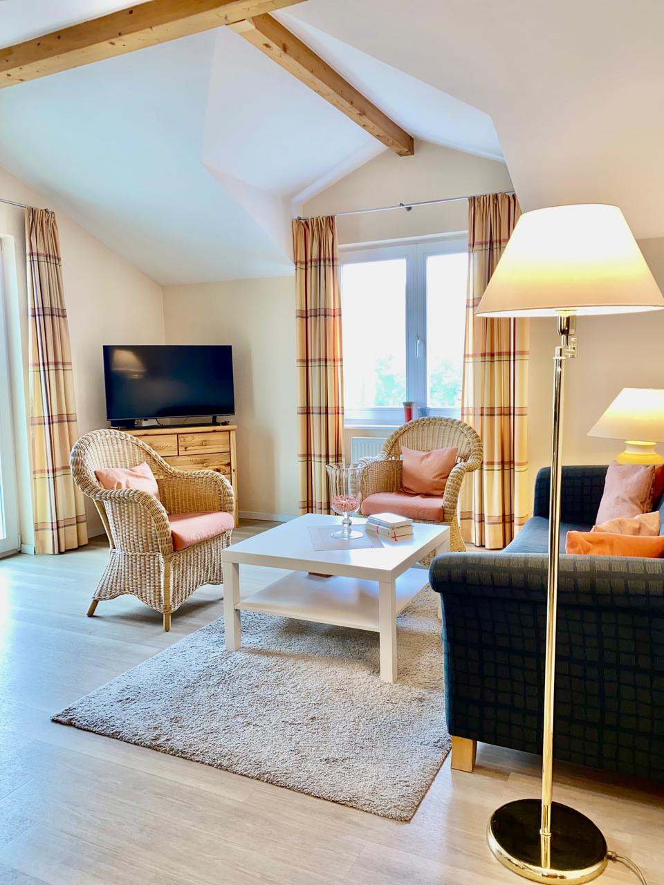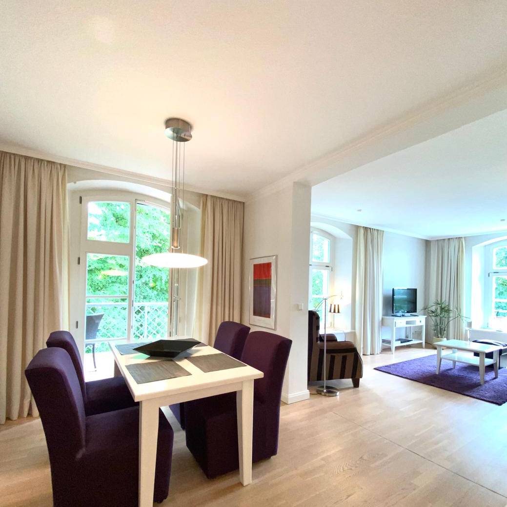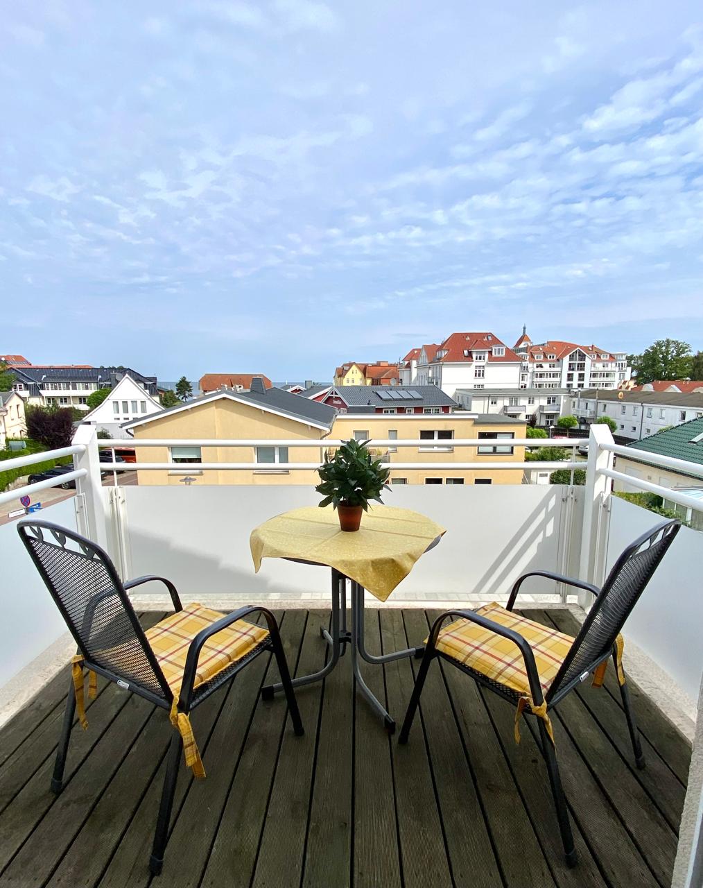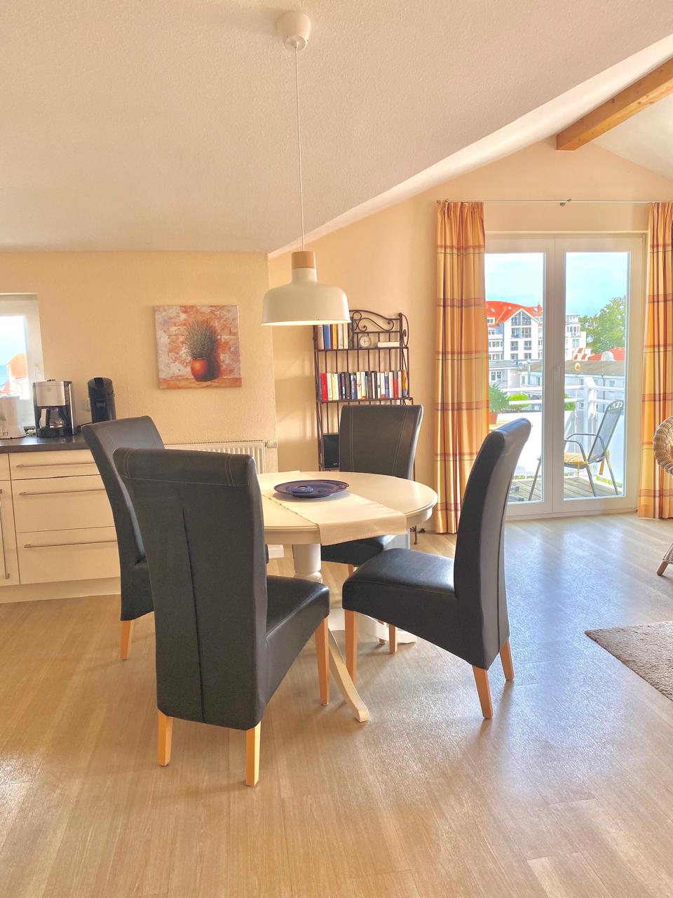 Unsere gemütliche Komfort-Ferienwohnung in Kühlungsborn bietet Seeblick und Platz für 2–3 Personen. Im geräumigen Wohnzimmer stehen Ihnen eine Sitzecke, ein runder Esstisch mit vier Stühlen, Kabel-TV, Stereoanlage sowie eine kleine Bibliothek zur Verfügung; die angrenzende Einbauküche ist mit 4-Zonen-Cerankochfeld, Mikrowelle, Geschirrspüler, Kühlschrank, Kaffeemaschine, Pad-Maschine, Wasserkocher und Toaster vollständig ausgestattet. Vom Balkon mit Sitzmöbeln genießen Sie den Blick auf die Ostsee und den Baltic Park und können warme Abende entspannt ausklingen lassen.