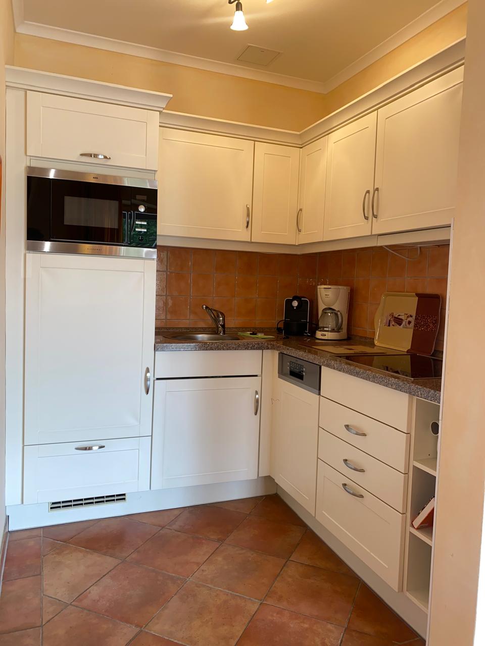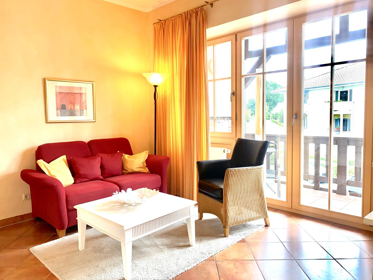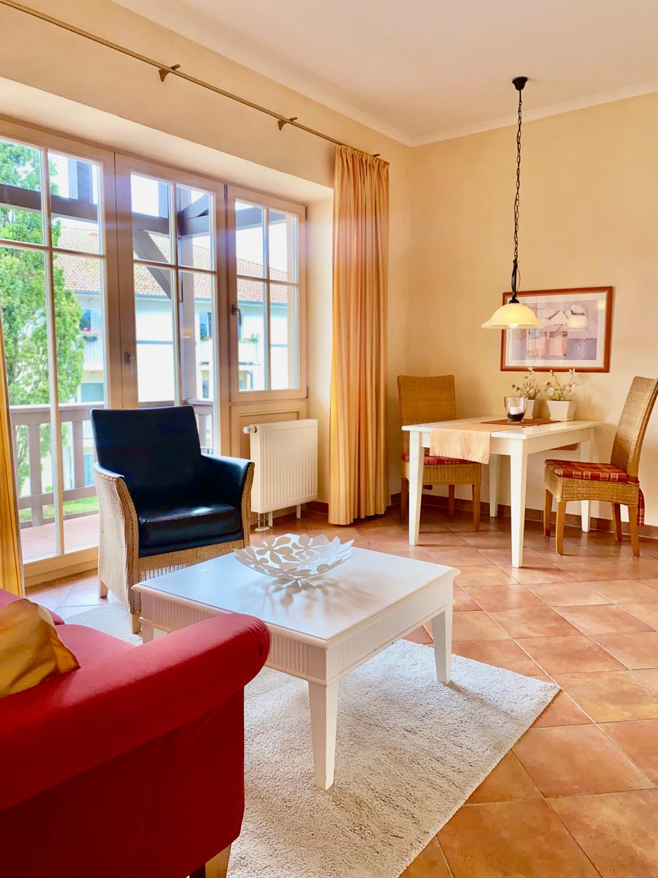 Herzlich willkommen in unserer mediterran gestalteten 50-Quadratmeter-Wohnung für zwei Personen in Kühlungsborn – erneut mit 4 Sternen ausgezeichnet. Die Wohnung befindet sich im 1. Obergeschoss und ist bequem per Lift erreichbar. Sie erwartet ein gemütliches Wohnzimmer mit Sitzecke, großem Esstisch, Flachbild-TV, HiFi-Anlage und Tivoli-Radio sowie eine voll ausgestattete Landhausküche inklusive Geschirrspüler, Kühlschrank, Mikrowelle, Ceranfeld, Kaffeemaschine, Wasserkocher und Toaster. Der Süd-West-Balkon mit bequemen Möbeln und Sonnenschirm lädt zum Entspannen ein.